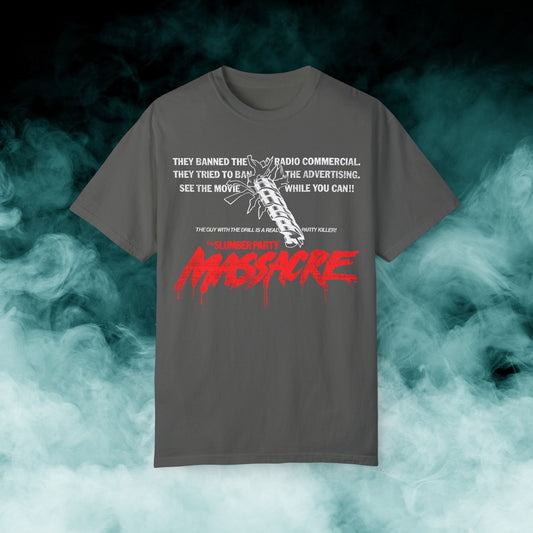 Slumber Party Massacre "He dressed to drill" Horror Movie T-shirt (Merch)