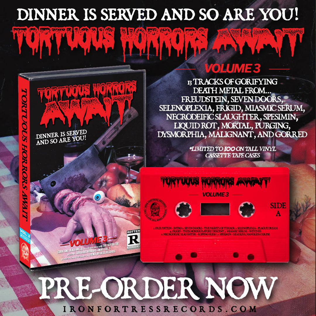 The annual and most gorifying death metal mixtape is now available to pre-order! Tortuous Horrors Await Vol. 3 packs 13 tracks of unrelenting and terrifying death metal on one special edition cassette tape.