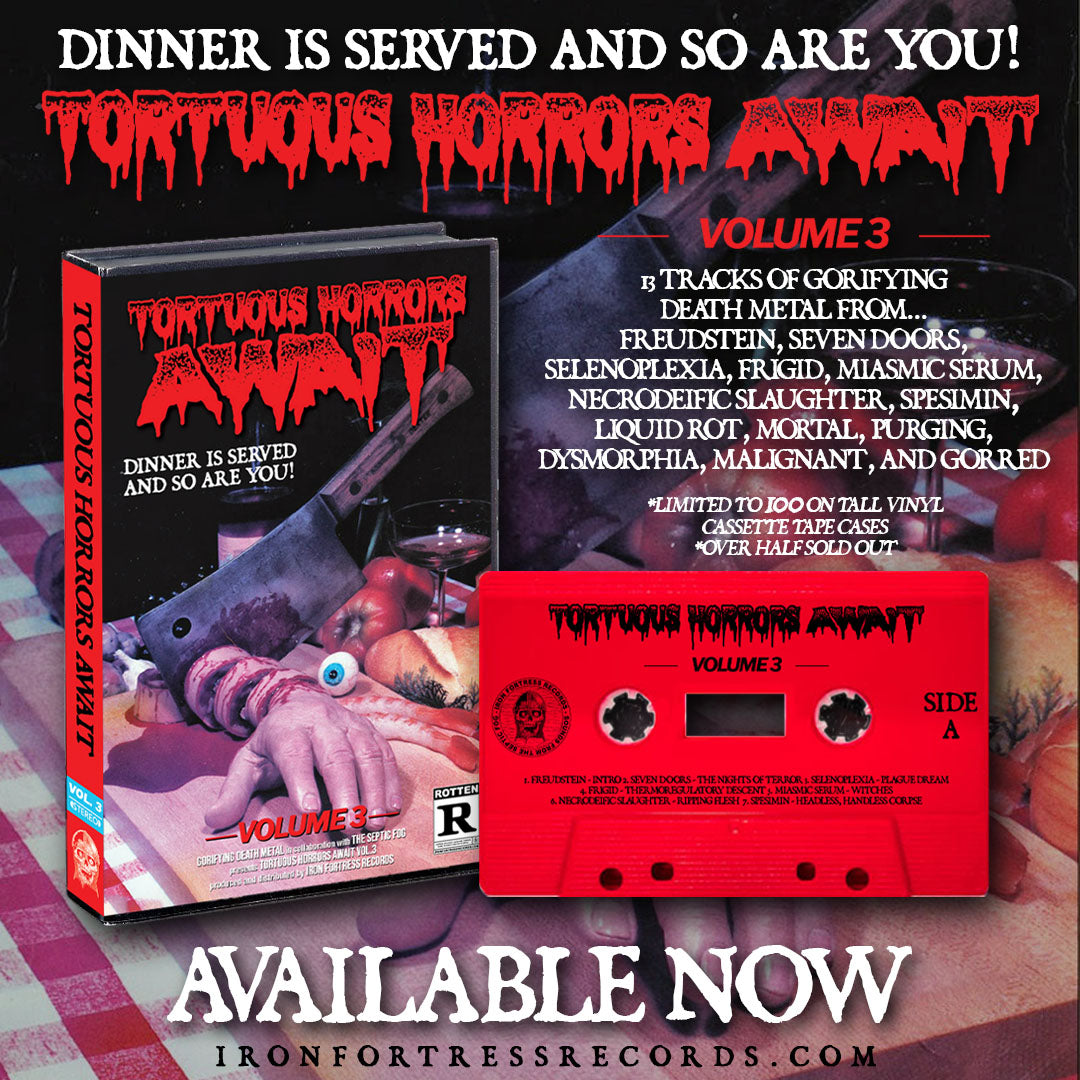 The annual and most gorifying death metal mixtape is now available to order! Tortuous Horrors Await Vol. 3 packs 13 tracks of unrelenting and terrifying death metal on one special edition cassette tape and is streaming now!